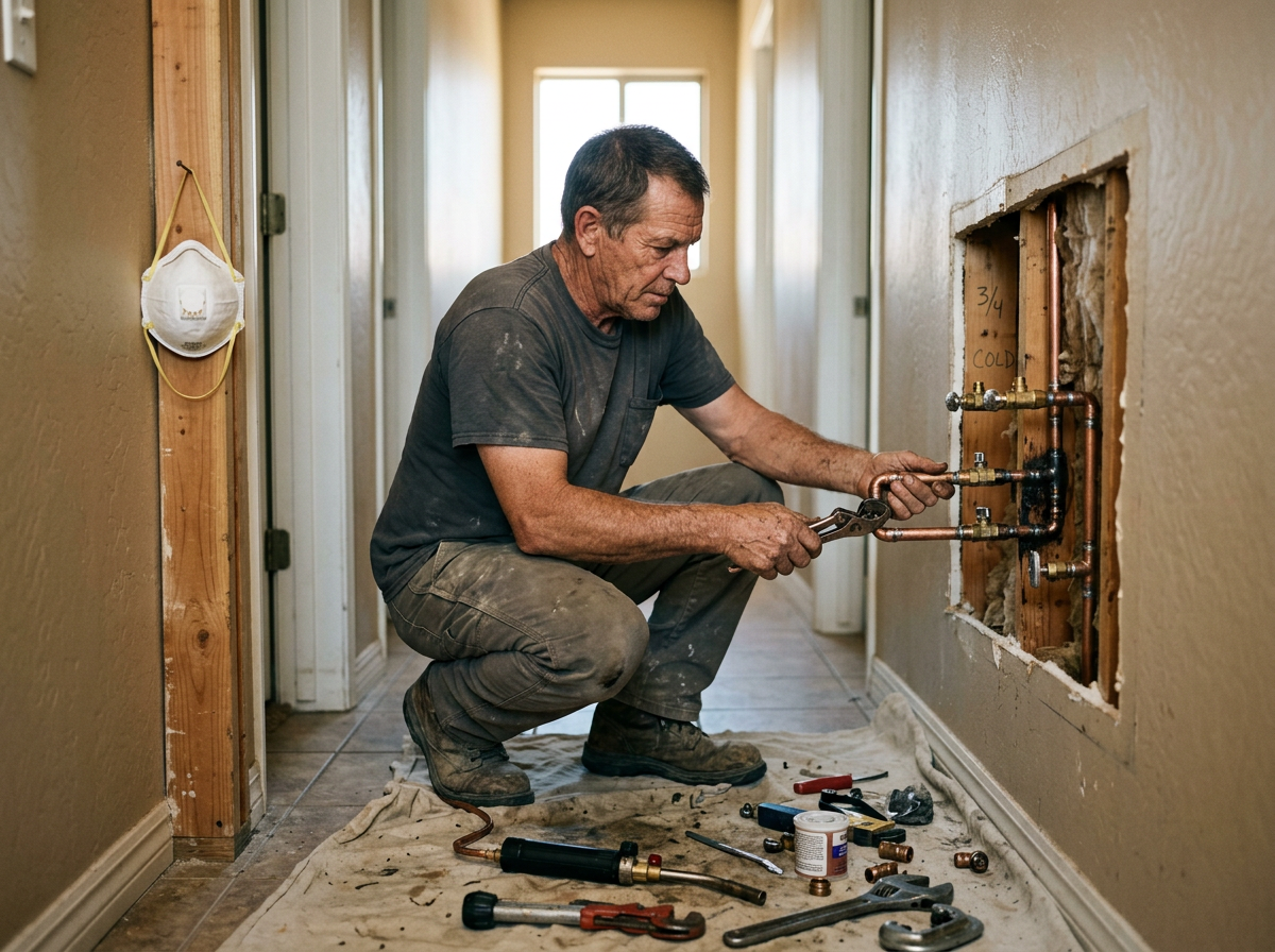 Pinhole leaks, brown water, low pressure — old galvanized or failing PB. Copper or PEX, permitted, inspected, drywall patched. Done in 2-3 days.